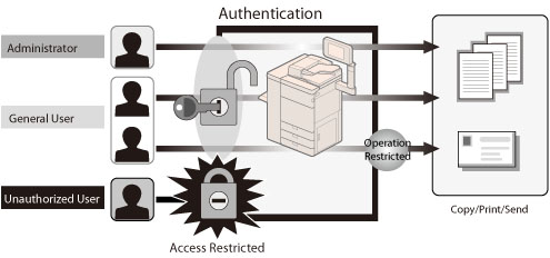 The authentication on this machine requests user information (user name and password) when users access the machine, and verifies that information. Only an authorized user that has successfully passed the authentication can operate the machine. You can prevent access by unauthorized users by managing the users for the machine. To use the authentication mode, you must first register the information for administrators and general users.