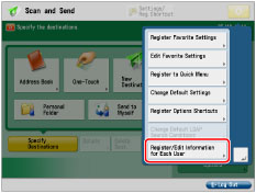 Press [Scan and Send] on the Main Menu screen → on the top right of the screen → [Register/Edit Information for Each User].