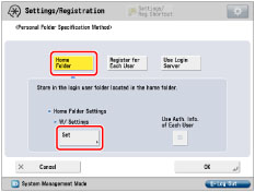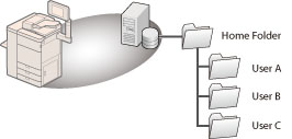 This function enables the administrator to register folders as personal folders. Each user can only use folders which are created under the Home Folder, a folder the administrator specified, and those folders are named with a login name for a file server.