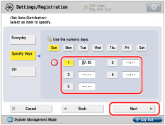 Press [Set Auto Distribution] for <Transmitting Settings> → select [Everyday] or [Specify Days].