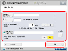 You can set and register a name and PIN for a mail box, as well as specify the time that has to elapse before the files in that mail box are automatically deleted.