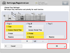 You can designate an output tray for multiple functions. The priority order of the output destinations is determined by the order of the selected output trays. The priority is displayed as "1" and "2." |