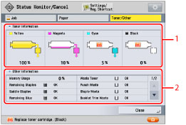 3 | Toner/Other Press to show the Toner/Other screen. You can check the remaining amount of toner and remaining amount and waste amount for consumables other than the toner. For more information, see "Toner/Other Screen." |