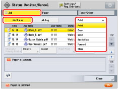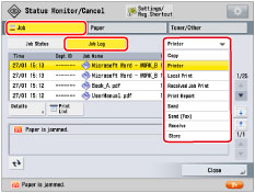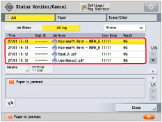 The canceled job appears as <NG> (No Good) on the Log screen. If the paper specified at the time the job was issued is not available, a message asking you to load the appropriate paper appears. Load the paper, and resume the job. If [Suspended Job Timeout] in [Function Settings] (Settings/Registration) is set to 'On', the job which is suspended because paper was not available for printing is displayed as a suspended job after a specified period of time elapses. To resume printing of the suspended job, load the paper → select the job → press [Details] → [Resume]. |