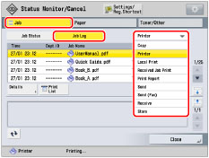You can print job status lists for Send/Send (Fax) jobs in addition to job log lists. To print job status lists, select [Send] or [Send (Fax)] from the drop-down list → press [Print List]. |