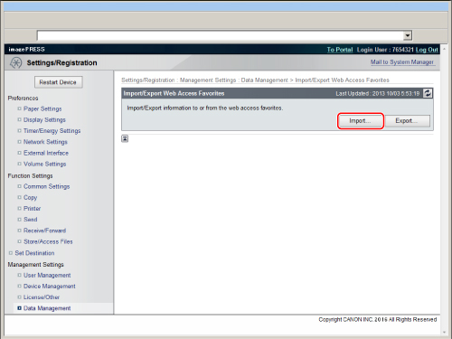When you import favorites from a computer file, the existing registered favorites in the machine are overwritten. When you import a file, use the same file format as the data that was exported. Data in a different format cannot be imported. |