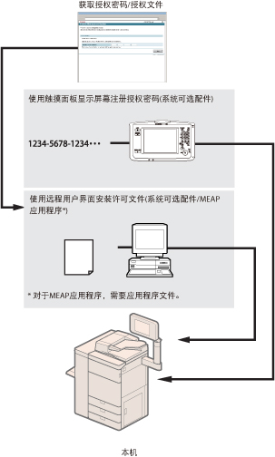 可以通过使用从“授权管理系统”获取的授权文件/授权密码安装系统可选配件/MEAP应用程序。