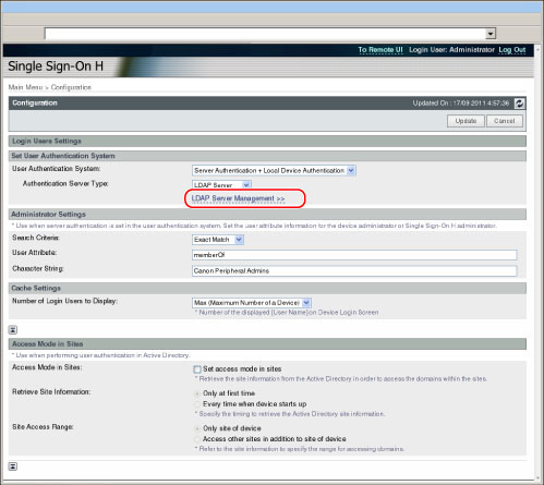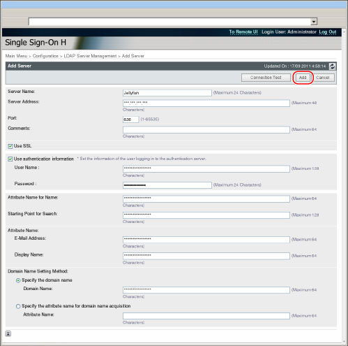 只有为[User Authentication System](用户认证系统)选择[Server Authentication + Local Device Authentication](服务器认证+本地设备认证),并且为[Authentication Server Type](认证服务器类型)选择[LDAP Server](LDAP服务器),才可以单击[LDAP Server Management](LDAP服务器管理)。 单击[LDAP Server Management](LDAP服务器管理)以显示[LDAP Server Management](LDAP服务器管理)屏幕时,会存储[Configuration](配置)中的设置。 |