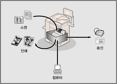 박스를 사용하면 사용자가 프린터 드라이버를 통해 개인 컴퓨터에서 송신된 데이터나 이 기기에서 스캔된 파일을 저장할 수 있습니다. 원하는 설정을 사용하여 필요에 따라 저장 문서를 인쇄할 수 있습니다. 또한 문서의 파일 형식을 PDF 등 다른 형식으로 변환하여 송신 기능을 통해 팩스로 전송하거나 이메일을 통해 송신할 수 있습니다.