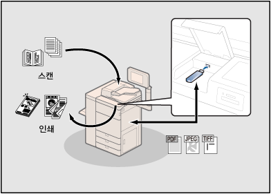 메모리 미디어는 USB 메모리를 기기의 USB 포트에 연결하여 사용할 수 있는 저장 장소입니다. 이 기기에서 문서를 스캔하여 컴퓨터에서 사용할 수 있는 다양한 파일 형식으로 메모리 미디어에 저장할 수 있습니다. 또한 원하는 인쇄 설정을 사용하여 언제라도 이 기기에서 메모리 미디어에 저장된 파일을 인쇄할 수도 있습니다.