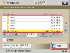 문서를 다시 선택하여 선택을 취소할 수 있습니다. 메모리 미디어에 두 개 이상의 문서가 저장된 경우 [명칭]이나 [날짜/시각]을 눌러 파일 리스트를 정렬할 수 있습니다. 파일을 정렬한 후 파일 선택 화면을 닫으면 다음에 파일 선택 화면을 열었을 때 파일이 정렬되지 않은 상태로 나타납니다. 파일을 선택한 상태에서 [명칭] 또는 [날짜/시각]을 누르면 해당 파일이 선택되지 않으며 파일 리스트 맨 위가 나타납니다. |