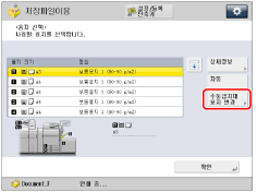 <수동급지대 용지변경: 용지 종류>의 상세 설정 리스트에 표시되지 않은 용지 종류를 등록할 수 있습니다. 용지 종류 저장에 대한 자세한 사항은 "사용자 설정 용지 종류 등록"을 참고하십시오. 인쇄할 예약 작업이 1개 이상 대기 중인 경우 예약된 인쇄 작업에 지정된 마지막 용지 크기/종류만 용지 선택 화면에 나타납니다. |