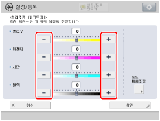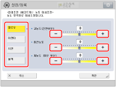 조정하려는 컬러를 선택한 후 → [-] 또는 [+]를 눌러 짙은(높음), 중간 및 엷은(낮음) 농도 영역의 농도 수준을 조정합니다.