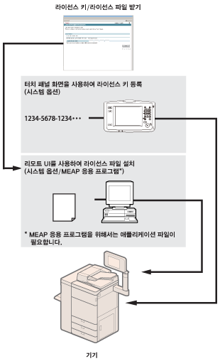 시스템 옵션/MEAP 응용 프로그램을 설치하려면 라이센스 관리 시스템에서 획득한 라이센스 파일/라이센스 키를 사용합니다.