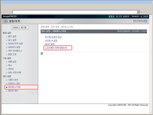 리모트 UI의 포털 페이지에서 [설정/등록] → [라이센스/기타] → [소프트웨어 등록/업데이트]를 클릭합니다.