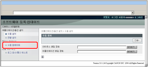 리모트 UI의 포털 페이지에서 [설정/등록] → [라이센스/기타] → [소프트웨어 등록/업데이트]를 클릭합니다.