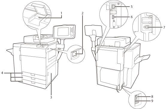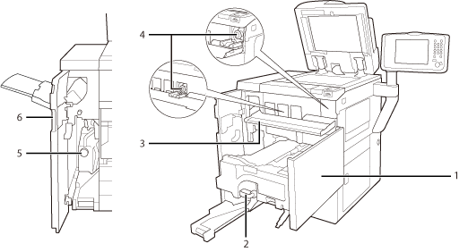 1. | 앞 커버 이동 정착기 내부에 걸린 용지를 제거할 때 이 커버를 엽니다. ("용지 걸림 제거" 참고) |
