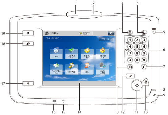 18. | 사용자메뉴 키 사용자메뉴에 저장된 즐겨찾기 기능을 검색할 때 누릅니다. 또한 인증을 사용하는 경우 각 사용자 별로 설정된 사용자메뉴가 표시될 수 있습니다. ("사용자메뉴" 참고) |