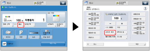 입력한 값에 따라 기기가 정확한 배율(줌)을 자동으로 계산합니다. 하지만 원고 이미지가 용지 크기에 따라 조금 잘릴 수도 있습니다.