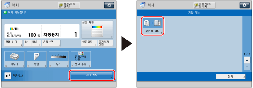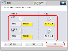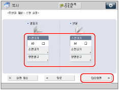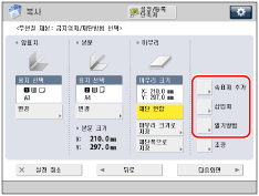 앞쪽 백지, 뒤쪽 백지 또는 삽지에 서로 다른 용지 크기를 설정한 경우, 다른 기능에 대한 용지 크기가 자동으로 새 용지 크기로 변경됩니다. 그러나 특정 기능에 대한 용지 공급원을 동일한 크기의 용지가 들어 있는 용지 공급원으로 변경해도 다른 기능에 대한 설정이 변경되지 않습니다. Document Insertion Unit-N1에서 용지를 급지하기 전에 용지를 Document Insertion Unit-N1에 넣고 용지 크기를 지정합니다. Document Insertion Unit-N1에서 용지를 급지하려면 [인서터 1] 또는 [인서터 2]를 선택합니다. 현재 작업을 위해 Document Insertion Unit-N1에서 용지가 급지되는 경우, [인서터 1 변경] 또는 [인서터 2 변경]을 눌러 삽지 용지를 선택합니다. |