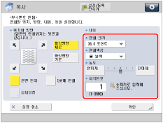 [부수인쇄 옵션]이 '해제'로 지정된 경우 [전면 인자] 및 [5곳에 인쇄]가 회색으로 처리되고 선택할 수 없습니다. ("부수 번호 인쇄 옵션" 참고) [페이지 번호 인쇄], [스탬프] 또는 [날짜인쇄] 중 두 가지를 설정하여 동일한 위치에서 인쇄한 경우 를 누르면 확인 메시지가 나타납니다. |