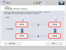 문자 또는 선을 선명하게 복사하려면 문자 영역에 대해 [강하게] 쪽의 설정을 선택해야 합니다. 인쇄사진 또는 기타 하프톤이 포함된 원고를 복사하려면 사진/화상 영역에 대해 [약하게] 쪽의 설정을 선택해야 합니다.