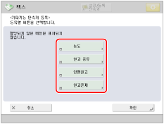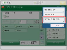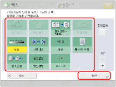 4개의 옵션 단축키가 팩스 기본 기능 화면에 나타납니다. [농도], [원고 종류], [양면원고] 및 [원고혼재]가 기본적으로 표시됩니다. 이 단축키를 자주 사용하는 기능으로 변경할 수 있습니다.