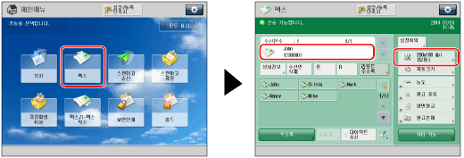 → [팩스]를 누르고 → 원하는 수신인을 지정한 후 → 스캔 크기 버튼을 누릅니다.