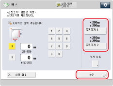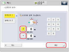 [X] 및 [Y]를 누르고 → 숫자 키를 사용하여 스캔 크기를 입력하고 → [확인]을 누릅니다.