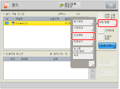 홀드 작업 리스트 또는 인쇄 작업 리스트에서 원하는 작업을 선택하고 → [삭제/편집] → [상세정보]를 누릅니다.