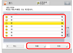 홀드 큐에서 모든 파일(맨 위에서부터 최대 100개 파일)을 선택하려면 [모두선택 (100 까지)]을 누릅니다. (문서를 선택하는 경우 이 키가 [선택해제]로 변경됩니다.)