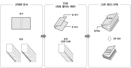이 모드를 사용하여 인쇄물에 접착제를 붙여 소책자를 만드는 방식으로 단면 또는 양면 원고를 인쇄할 수 있습니다.
