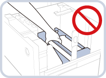 용지 데크에 용지를 넣을 때 뒤쪽 가장자리 리테이너에 강한 충격을 가하지 마십시오. 오작동이 발생하거나 기기에 손상을 줄 수 있습니다. ![]() 외부 크기 변경 판, 내부 크기 변경 판 및 뒤쪽 가장자리 리테이너를 올바르게 조정하여 용지가 걸리거나 지저분하게 인쇄되거나 기기 내부가 지저분해지지 않도록 하십시오. 말린 용지는 페이퍼 데크에 적재하기 전에 똑바로 펴야 합니다. 제한 표시( )를 초과하여 용지를 적재하거나 페이퍼 데크를 기기 안으로 완전히 밀어넣지 않은 경우에는 복사 또는 인쇄할 수 없습니다.용지 높이가 제한 표시( )를 넘지 않도록 하십시오.항상 페이퍼 데크가 제자리에 있는지 확인하십시오. 페이퍼 데크 빈 부분에 용지를 넣거나 다른 물체를 넣지 마십시오. 그럴 경우 기기가 손상될 수 있습니다. |
