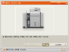 터치 패널 화면에서 [이전화면] 또는 [다음화면]을 눌러 폐토너통에 대한 모든 지침에 접근할 수 있습니다. 인쇄 작업 중에 폐토너통을 교체해야 하는 경우, 새로운 폐토너통을 설치한 후에 남은 인쇄가 진행됩니다. |