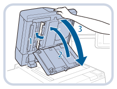 커버와 피더를 닫을 때 손가락이 끼지 않도록 주의하십시오. 부상의 원인이 될 수 있습니다. 피더를 닫을 때 원고대에서 매우 밝은 광선이 방출될 수 있으므로 주의하십시오. |
