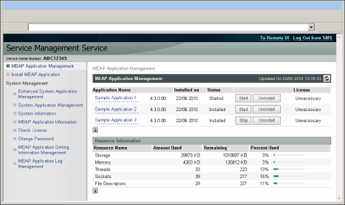 [MEAP Application Management] | 기기에 설치된 프로그램의 상태 등이 표시됩니다. |