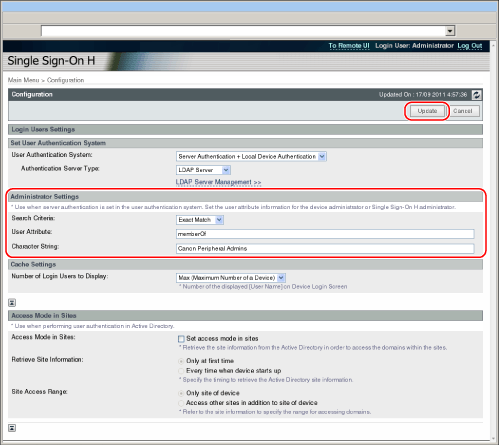 Search Criteria: | [Exact Match], [Partial Match], [Start with] 또는 [End with]를 선택합니다. LDAP 서버에서 얻은 특성 값을 로그인할 때 이 화면에서 지정한 사용자 그룹명과 비교하기 위한 검색 기준을 선택합니다. |
