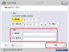[DNS 설정]에 대해 [DNS 서버 주소 설정]을 누르고 → <IPv6>에서 다음 항목을 지정하고 → [확인]을 누릅니다.