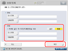 [DNS 설정]에 대해 [DNS 호스트명/도메인명 설정]을 누르고 → <IPv6>에서 다음 항목을 지정하고 → [확인]을 누릅니다.