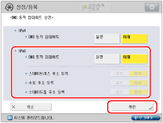 [IPv6 설정]에 대해 [IPv6 사용]을 누르고 → [설정] → [확인]을 누릅니다.