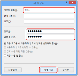[새 사용자] 대화 상자에서 [사용자 이름]에 사용자 이름을 입력하고 → [암호]에 비밀번호를 입력한 다음 → [암호 확인]에 비밀번호를 다시 입력하고 → [만들기]를 클릭합니다.