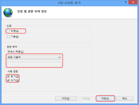<액세스 허용>에 FTP 사이트에 접근할 수 있도록 하려는 사용자/그룹을 설정합니다.