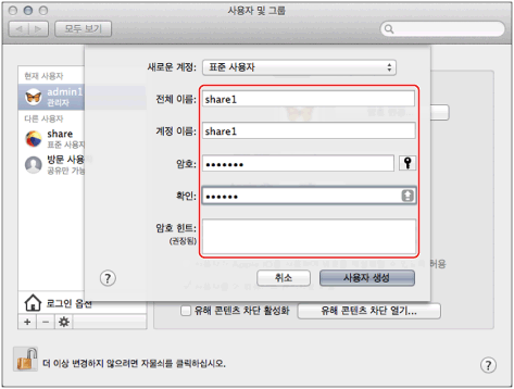 [계정]/[사용자 및 그룹] 창에서 Mac OS X를 통해 기기에서 데이터를 전송하고자 하는 사용자 이름을 입력하고 → 암호를 입력합니다.