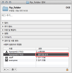 <사용 권한>에 대해 [읽기] 와 [쓰기]를 모두 선택하고 → [마침]을 클릭합니다.