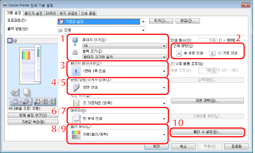 [기본 설정] 탭은 드라이버의 몇 가지 기본 설정으로 구성됩니다. [기본 설정] 탭에서 구성할 수 있는 설정은 다른 탭에서도 구성 가능합니다. 프린터 드라이버 화면을 표시하는 방법에 대한 자세한 내용은 "인쇄" 또는 "기본 인쇄 설정 구성"을 참고하십시오. 프린터 드라이버 화면에 표시되는 항목과 사용 가능한 기능은 사용 중인 프린터 모델에 따라 다릅니다. |