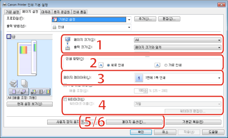 1. 출력 용지 크기 | 프린터에서 실제로 출력되는 용지 크기를 선택할 수 있습니다. "문서 배율 조정"을 참고하십시오. | 2. 인쇄 방향 | 용지 방향을 기준으로 인쇄 방향을 설정합니다. |