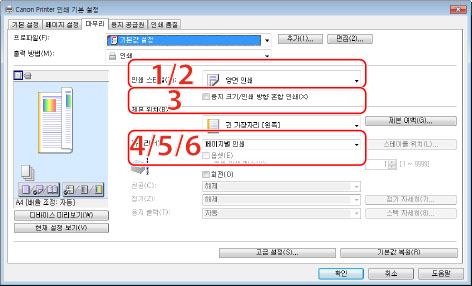 프린터 드라이버 화면을 표시하는 방법에 대한 자세한 내용은 "인쇄" 또는 "기본 인쇄 설정 구성"을 참고하십시오. 프린터 드라이버 화면에 표시되는 항목과 사용 가능한 기능은 사용 중인 프린터 모델에 따라 다릅니다. |