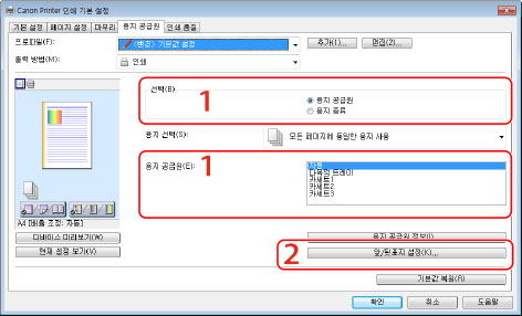 특정 유형의 용지에 인쇄하려는 경우에는 용지가 들어 있는 급지 위치 또는 용지 종류를 지정합니다.