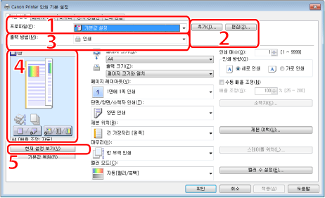 1. 프로파일 | 프로파일을 선택하여 동일한 인쇄 설정을 편리하게 반복 적용할 수 있습니다("인쇄에 사용할 프로파일 선택" 참고). | 2. 프로파일 추가/편집 | 프로파일 설정을 추가 및 편집할 수 있습니다. |