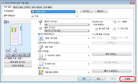 프린터 드라이버 화면에서 [도움말]을 클릭하여 도움말을 표시할 수 있습니다.